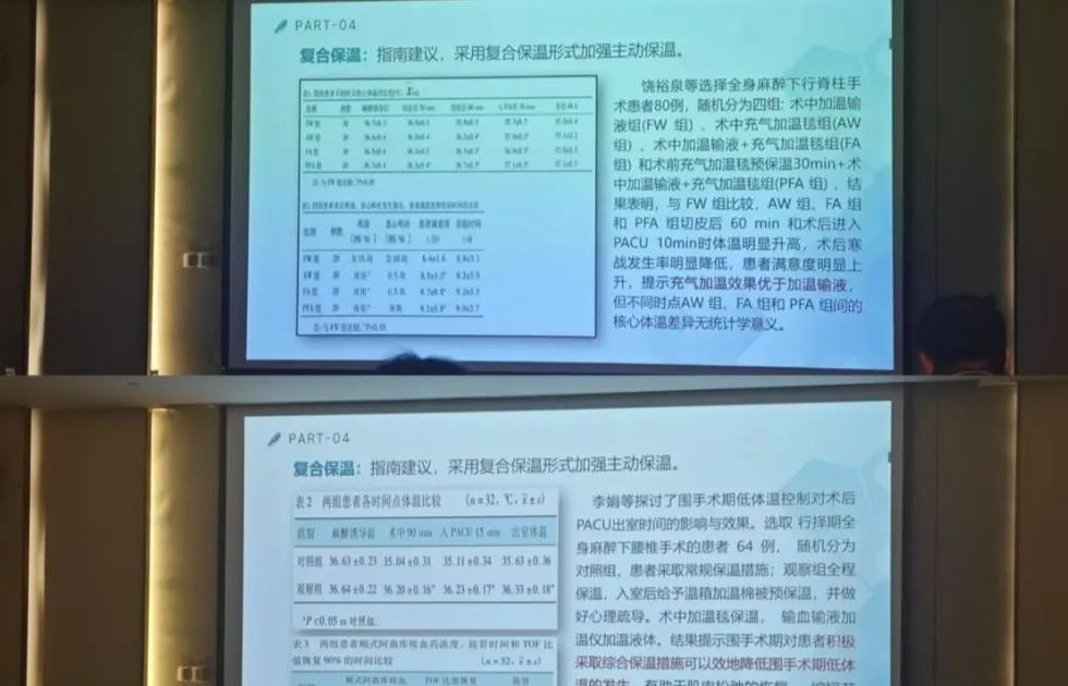 指南建议,采用复合保温形式加强主动保温。叶教授在谈到具体防治措施时重点提到“复合保温”,并引用相关对比研究,结果提示:围术期对患者采取综合保温措施可以有效地降低围手术期低体温的发生,有助于肌肉松弛的恢复,缩短苏醒时间,减少PACU滞留时间,提高PACU周转率促进手术高效衔接。
